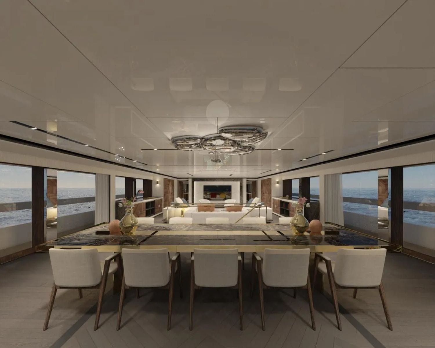Om de versmelting tussen de binnen- en buitengebieden te bevorderen is er een strandclub, evenals grote raampartijen en enorme dekruimtes. Wat verder opvat, is de eigenaarssuitte. Het bovendek is namelijk volledig gewijd aan de volgende eigenaar. Het jacht beschikt ook over een overloopzwembad, een helikopterplatform, een fitnessruimte en een bioscoop, waardoor de gasten zich kunnen vermaken en ontspannen tijdens hun vaarreis.