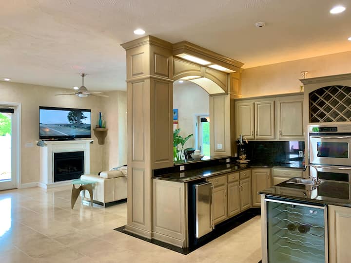 Verder is er qua vertier nog een gym, een zwembad en een grote achtertuin met ligstoelen en een bar. Het is dan ook bedoeld voor grotere groepen en heeft het adres twaalf bedden en zes badkamers voor je klaarstaan. Evenals een basketbal-, voetbal-, een tennisveld, een kinderspeelplaats, een golfbaan en zelfs ruiterpaden.