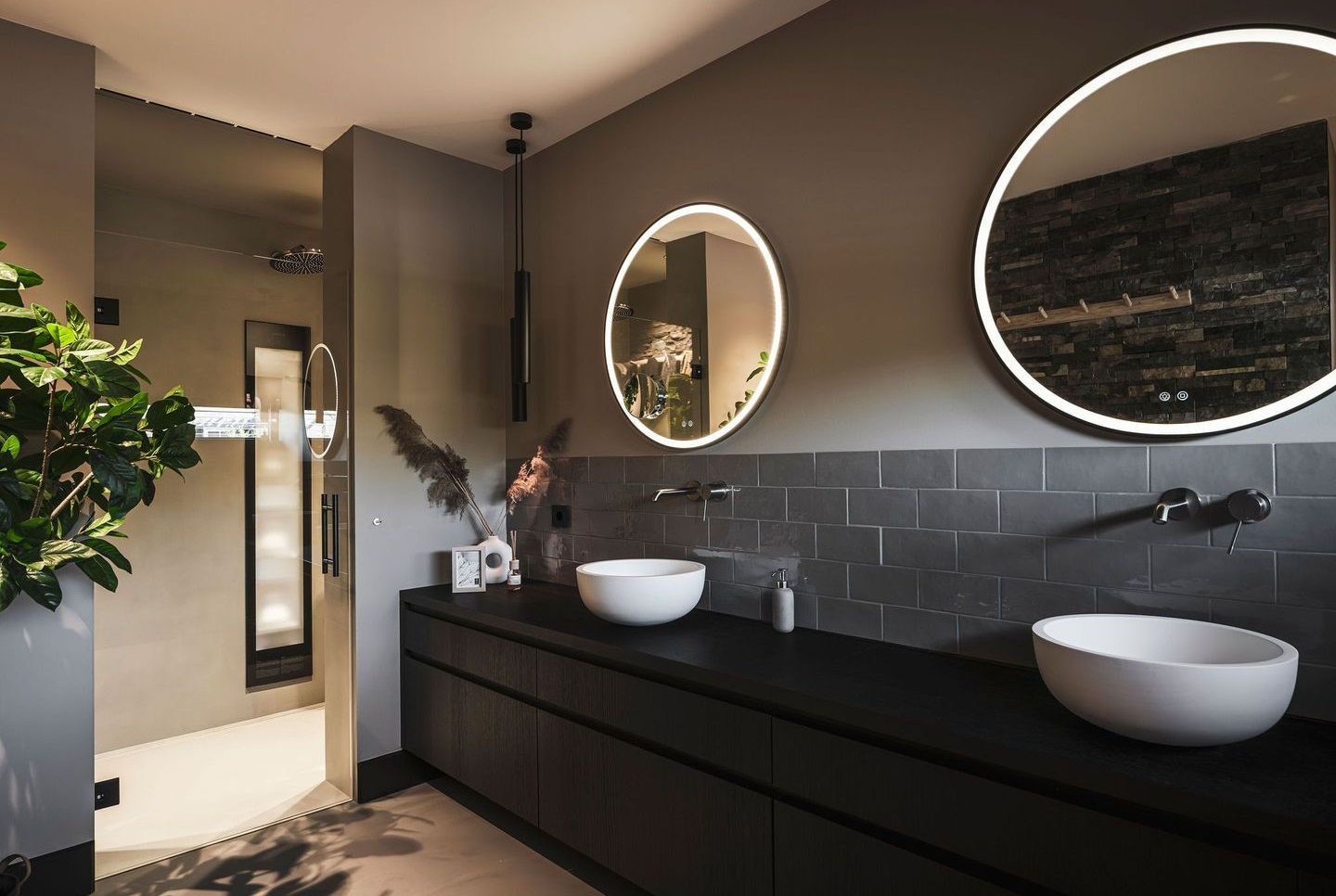 Door middel van een moderne trappartij is de bovenliggende verdieping te betreden, waar we de hoofdbadkamer van deze futuristische villa aantreffen. Naast dit sanitair, beschikt de woning over een vijftal kleinere badkamer, zodat er aan baden en douches geen gebrek zal zijn. De hoofdbadkamer, die is voorzien van een moderne regendouche en een wastafel met dubbele wasbak, is zeer strak en laat qua afwerking niets aan het toeval over. Alsof het zestal badkamers en het riante buitenzwembad nog niet genoeg watervoorziening realiseert, is er aan de achterzijde van de villa nog een meterslange zwemvijver geplaatst. ‘Groots met een zachte ‘G’, aldus Christie’s Real Estate. Dat heeft het makelaarsbedrijf juist gezien.