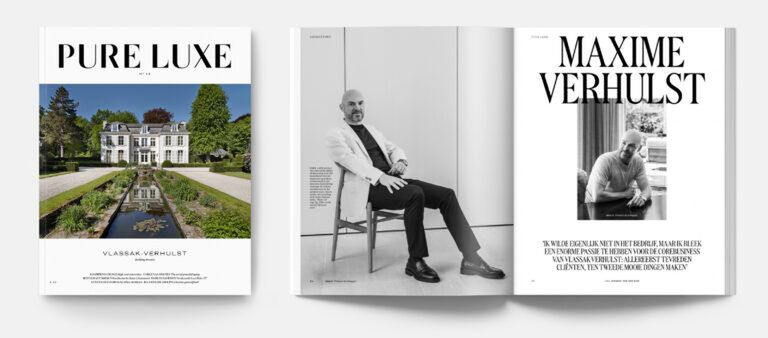 Op de cover staat Vlassak-Verhulst: Een statige poort verleent toegang tot de parkeergelegenheid voor het pand waarin vooraanstaand villabouwer Vlassak-Verhulst is gevestigd. Het voormalige nonnenklooster met sacrale elementen heeft een rijke geschiedenis en is – hoe kan het ook anders – beeldschoon gerenoveerd. Na een warm ontvangst en een uitgebreide rondleiding, neemt Maxime Verhulst tegenover mij plaats. ‘Ik wilde eigenlijk niet in het bedrijf, maar ik bleek een enorme passie te hebben voor de corebusiness van Vlassak-Verhulst: Allereerst tevreden cliënten, ten tweede mooie dingen maken’